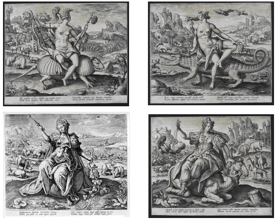 Marten de Vos y Adriaen Collaert. Las alegorías de los continentes, Amsterdam. 1600. Superior: América, África. Inferior: Europa y Asia.