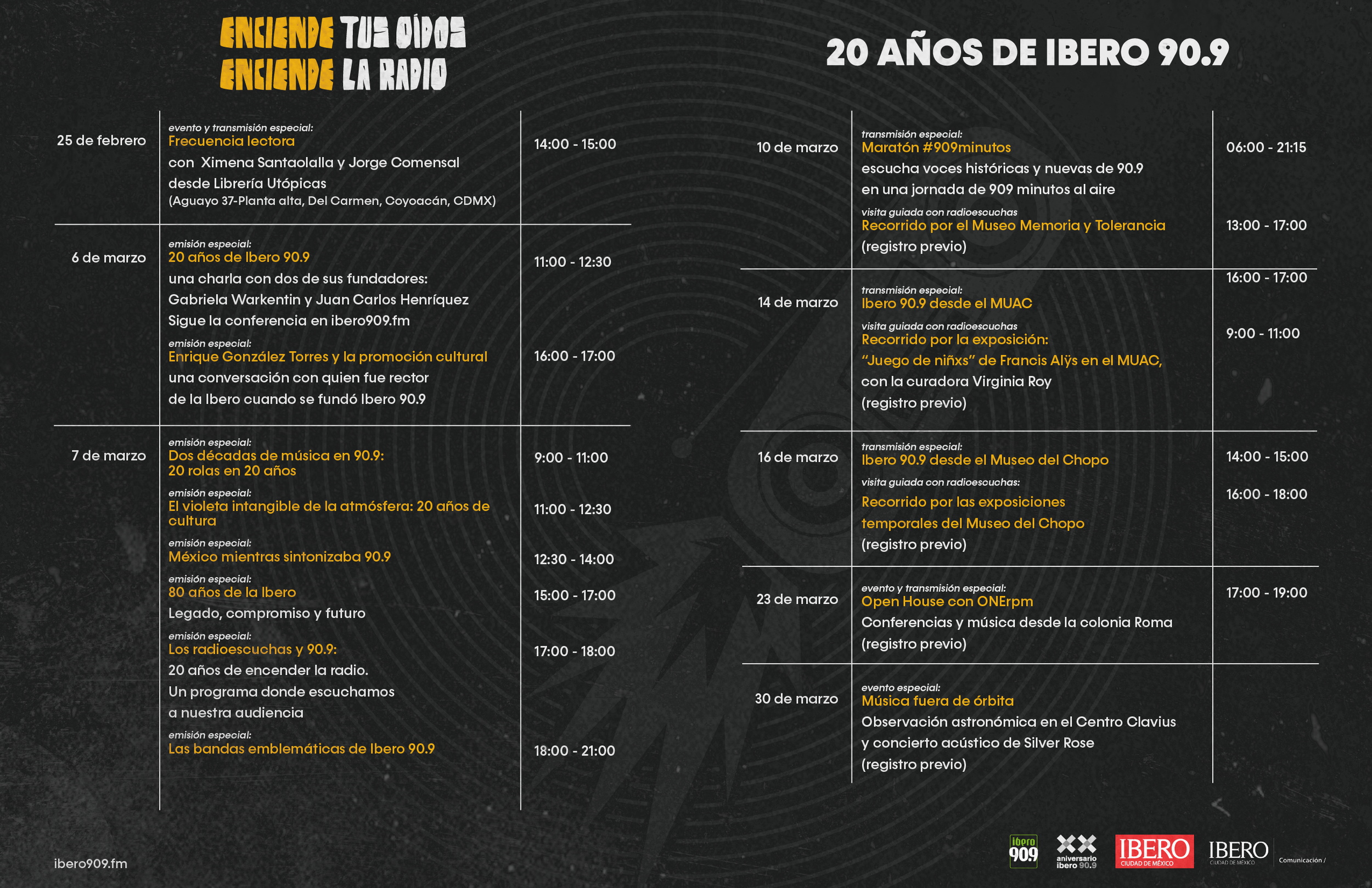 De 9 de la mañana a 9 de la noche, te presentaremos las 20 rolas que han marcado la 90.9; hablaremos de lo que ha pasado en los últimos 20 años en nuestro México; celebraremos los 80 años de la Universidad Iberoamericana; te pondremos música de las bandas más emblemáticas de Ibero 90.9; y le daremos espacio a las y los radioescuchas en una emisión especial dedicada a nuestro público.