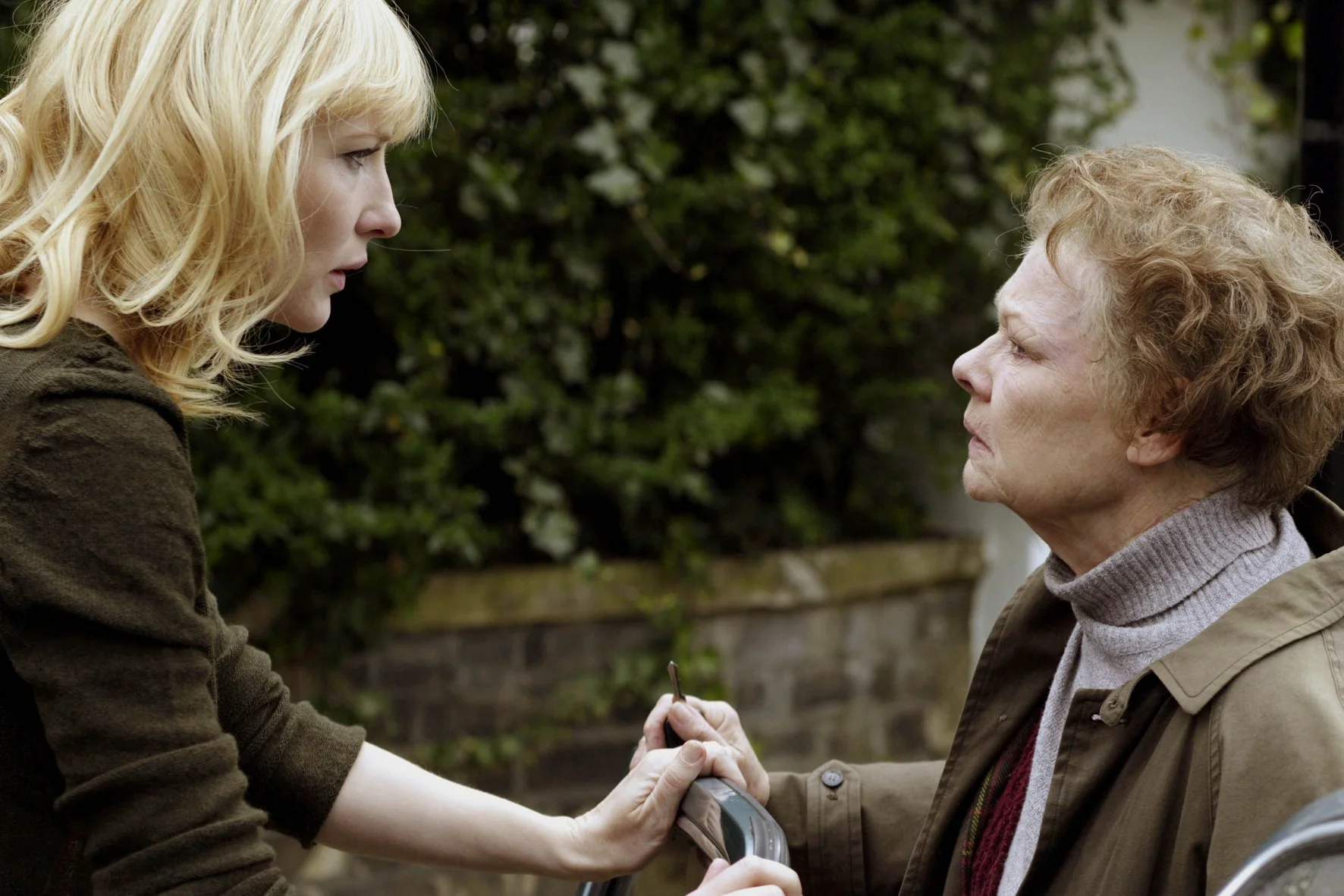 Declara la voz áspera e hipnótica de Judi Dench, mientras un paneo por los estantes de su casa nos revela las decenas de cuadernos que celosamente resguardan sus memorias y confesiones más íntimas. Así, la música de Glass continúa acompañándola—y a nosotros— a lo largo de un montaje introductorio que nos muestra su rutina monótona y amarga como una maestra rigurosa e indolente que critica las condiciones sociales de sus alumnos, a quienes desdeña en pensamiento. Mientras los mira entrar desde la planta alta de la escuela, como un buitre furtivo, se percata de una joven rubia de aspecto desenfadado que de inmediato aviva su interés: Sheba Hart (Cate Blanchett), la nueva profesora de arte.