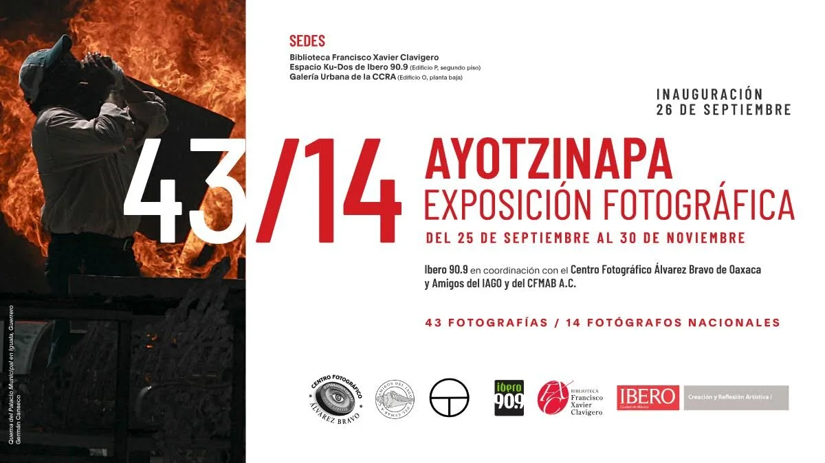 La Inauguración de la muestra 43/14 - Ayotzinapa. Exposición Fotográfica, es una muestra colectiva que reúne imágenes de 14 fotógrafos. Abordan los actos violentos ocurridos el 26 de septiembre del 2014 en Iguala Guerrero, contra los 43 estudiantes desaparecidos de la Escuela Normal Rural de Ayotzinapa.