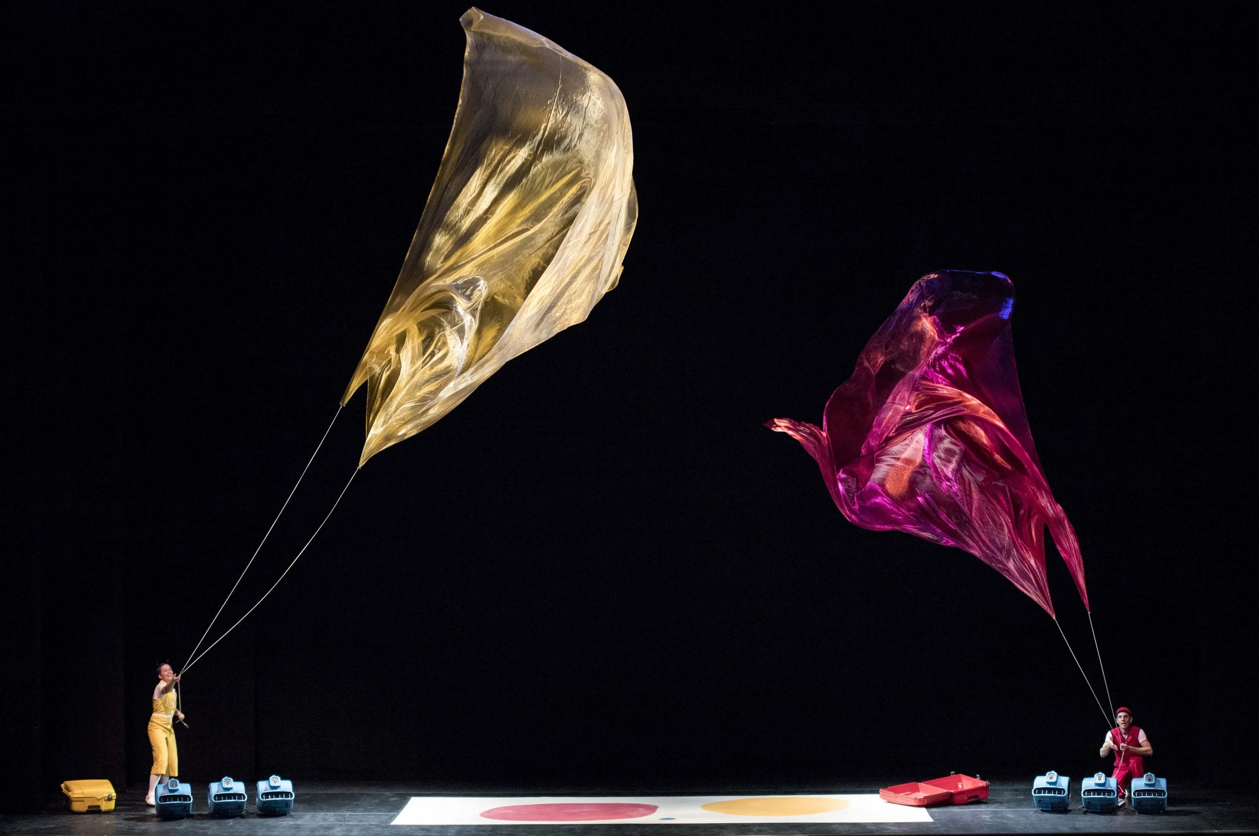 Los globos volaban y las telas parecían óleos flotando por el aire. Ellos con una sonrisa parecían convertir en vaporosa la atmósfera del escenario, para después meterse en unos grandes globos y bailar rítmicamente.