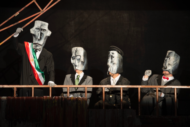 Como claroscuro, la obra también tiene brillantes y refrescantes momentos de humor negro y sátira. A manera de cartones de burla política, hace referencia a las cabezas enmascaradas y ciegas de los mandos del poder: su altiva indiferencia, su vacío espíritu ante la injusticia y sus prioridades más enfocadas en saciar sus gustos elitistas que en la seguridad de su pueblo. A la vez, hace una burla y despertar a todos los “expertos en política” que somos todos en las redes sociales, a toda la gente que prefiere comentar y publicar emojis; a los que prefieren grabar con sus celulares a hacer algo cuando se presenta alguna situación de peligro, pero se comprende...todos tenemos miedo de hacer algo.