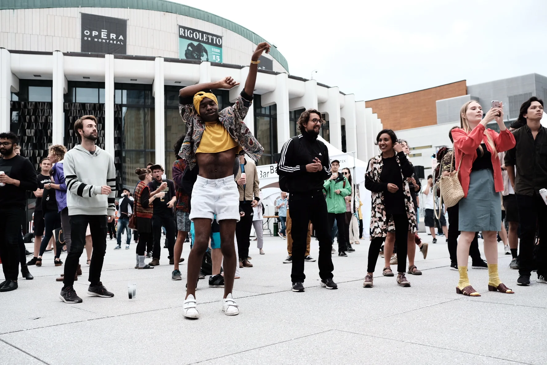 Ya en el Monument National, un edifico neoclásico del Siglo XIX con más pisos de los que pareciera delatar su fachada, nos encontramos con Chloé, una de las chicas del crew del festival, quien nos condujo a la sala de medios hasta un extenuante 6o. piso, en escaleras de doble vuelta y sin elevador. Sin embargo, la vista, la arquitectura, los pisos de mármol y los escalones crujientes de madera lo compensaron. La arquitectura siempre lo logra. En el lobby, nos topamos nada más y nada menos que con el mismísimo Alain Mongeau, a quien Chloé nos presentó y lo invitó para una entrevista el sábado. Con un gesto hierático y pocas palabras, accedió. Horas más tarde, yo lo vería en la Esplanade de la Place des Artes, mientras Willow Bell —muy parecido a nuestro Mario Morales de Modo Avión— se echaba un set “housero” por ahí de las 18:00 hrs. A pesar de la hora, el cielo aún era claro y luminoso. En Montreal, a las 20:00 hrs. todavía hay sol. Durante su sesión de casi una hora, me sentí como en un mini Bahidorá: gente de todas las edades, incluso niños bailando breakdance, sacaron sus pasos más freaks, robóticos y “vogueros” sin prejuicios ni miramientos.