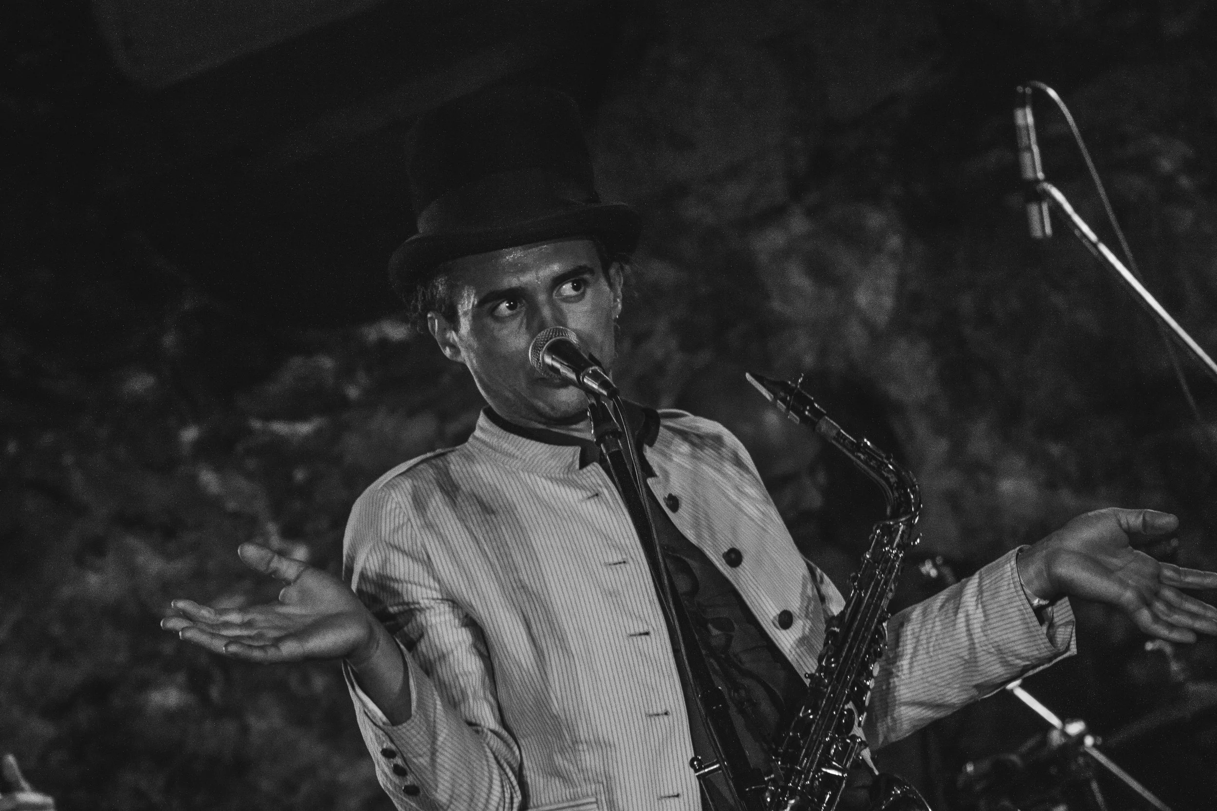 Tras unos minutos, subieron al escenario seis hombres y una mujer. Venían vestidos con atuendos coloridos y excéntricos, incluso algunos descalzos. Se paraban juguetones ante las personas que tenían como público. Al fondo, nosotros como prensa, disparábamos las cámaras instantáneamente al ver su bizarro comportamiento. La selección de instrumentos que portaban era poco común: acordeón, mandolina, violín, contrabajo, clarinete, saxofón y batería.