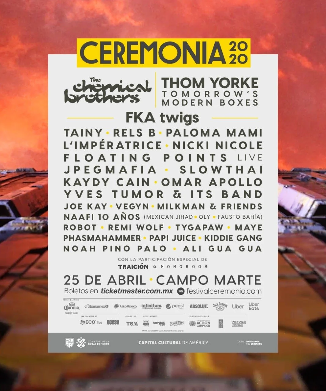 Con la fecha para la octava edición de Ceremonia cada vez más cerca, el aclamado festival no pierde su cualidad de traer artistas de primer nivel en su lineup. Thom Yorke, The Chemical Brothers y FKA twigs encabezan el cartel del festival. Además sonarán artistas como la DJ/productora Tygapaw y el rapero británico Slowthai, entre muchos otros. Este 2020, Ceremonia se muda al Campo Marte en la Ciudad de México para celebrarse el 25 de abril.
