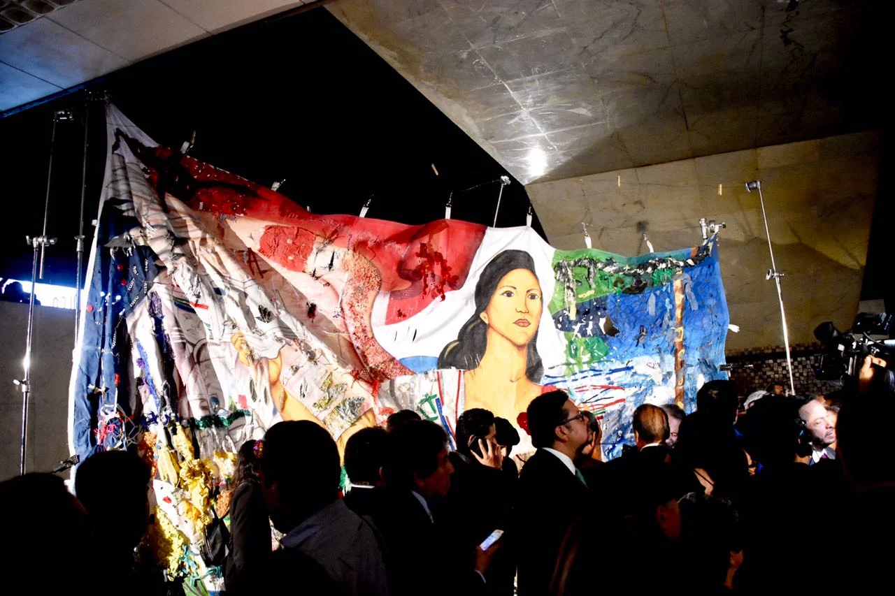 Al terminar la conferencia, el Rector de la Ibero David Fernández Dávalos hizo la entrega oficial, a nombre de la Universidad Iberoamericana, de la pieza artística “La Patria Desgarrada” —proyecto estético multidisciplinarios encabezado por el académico— Juan Carlos Henriquez, al Dr Graue, rector de la UNAM.