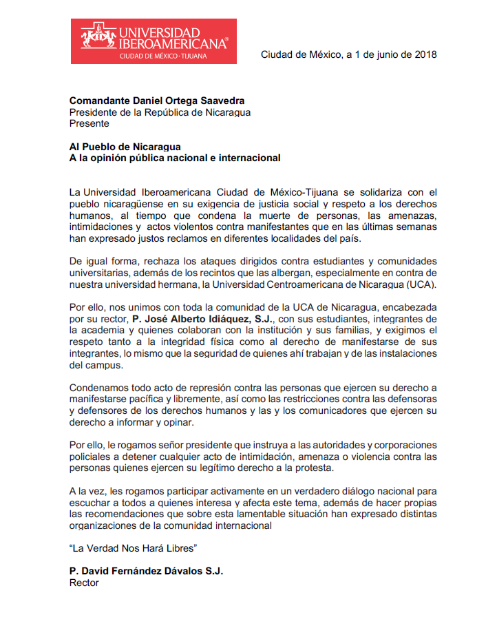 El pasado viernes 1 de junio, el rector de la Universidad Iberoamericana CDMX, el Padre David Fernández Dávalos, hizo una declaración por medio de la cual se une a la lucha con el rector de la Universidad Centroamericana (UCA), el Padre José Alberto Idáquiez, quien ha recibido amenazas de muerte.