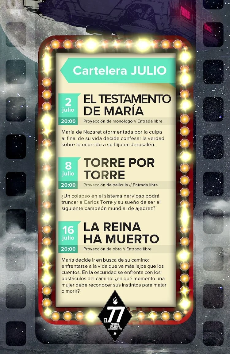 El 77 nos invita con la gran esperanza de volver a sentir la experiencia del teatro de manera física en la colonia Juárez de la CDMX. Todas sus actividades serán comunicadas a través de sus redes sociales: Facebook (El77Centro Cultura Autogestivo), Instagram (El77cca) y Twitter (El77cultural).