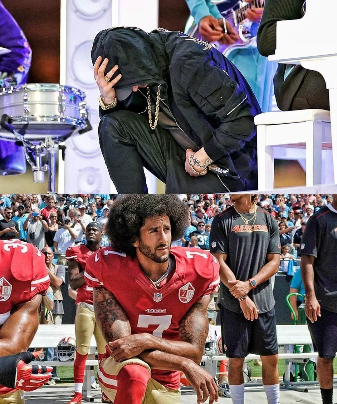 El arrodillamiento de Marshall Bruce Mathers III, conocido como Eminem, se produjo con una alineación de las estrellas del hip-hop, R & B y rap, que tocaron sus éxitos de la vieja escuela, en el SoFi Stadium en Inglewood, California, durante el medio tiempo del Super Bowl del 2022.