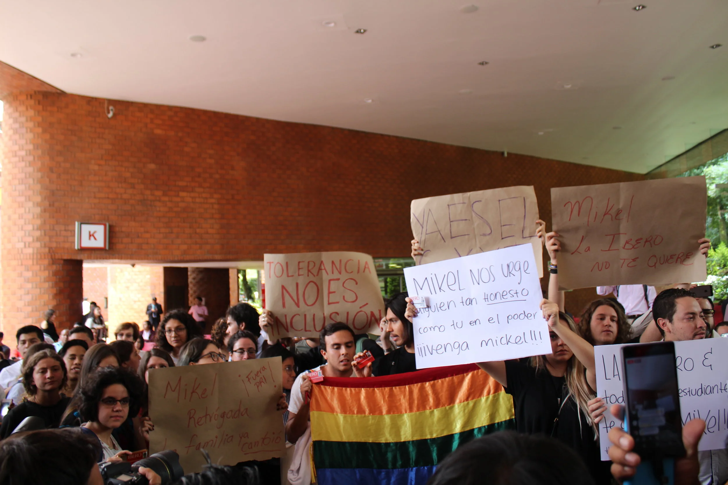 A fuera del Auditorio Sánchez Villaseñor, donde se dio cita al encuentro con los candidatos, parecían existir dos bandos: algunos apoyaban la campaña del candidato con gritos como “¡Mikel, amigo, la Ibero está contigo!” mientras que otros se expresaban a favor de los derechos de la mujer y la comunidad LGBT+ con pancartas y consignas en contra de Arriola. Entre empujones, gritos viscerales y una que otra muestra de apoyo, el candidato se dirigió a la Casa de Meditación de la Ibero para dar una entrevista exclusiva para el proyecto radiofónico de la universidad, Ibero 90.9.