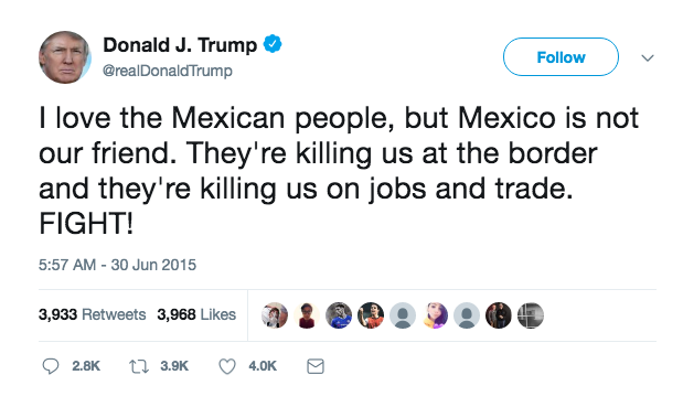 La situación que se vive entre Estados Unidos y México no es tan diferente, ya que cada vez más se buscan implementar barreras físicas y simbólicas que resalten lo que nos hace diferentes. Múltiples tweets y discursos de Trump han llenado nuestras pantallas; crímenes de odio ocurren a diario en Estados Unidos contra hispanos, manifestando que no pertenecen al país y que necesitan irse.