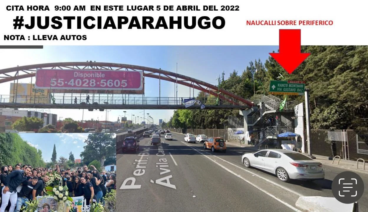 Maureen Amaro, madre de Hugo, exigió justicia para su hijo a través de un video publicado en Twitter en el que invitó a la gente y a medios de comunicación a que acudieran a apoyarla para exigir #JusticiaParaHugo en la avenida Periférico Norte, a la altura del Parque Naucalli, en Naucalpan, Estado de México, el pasado 5 de abril.