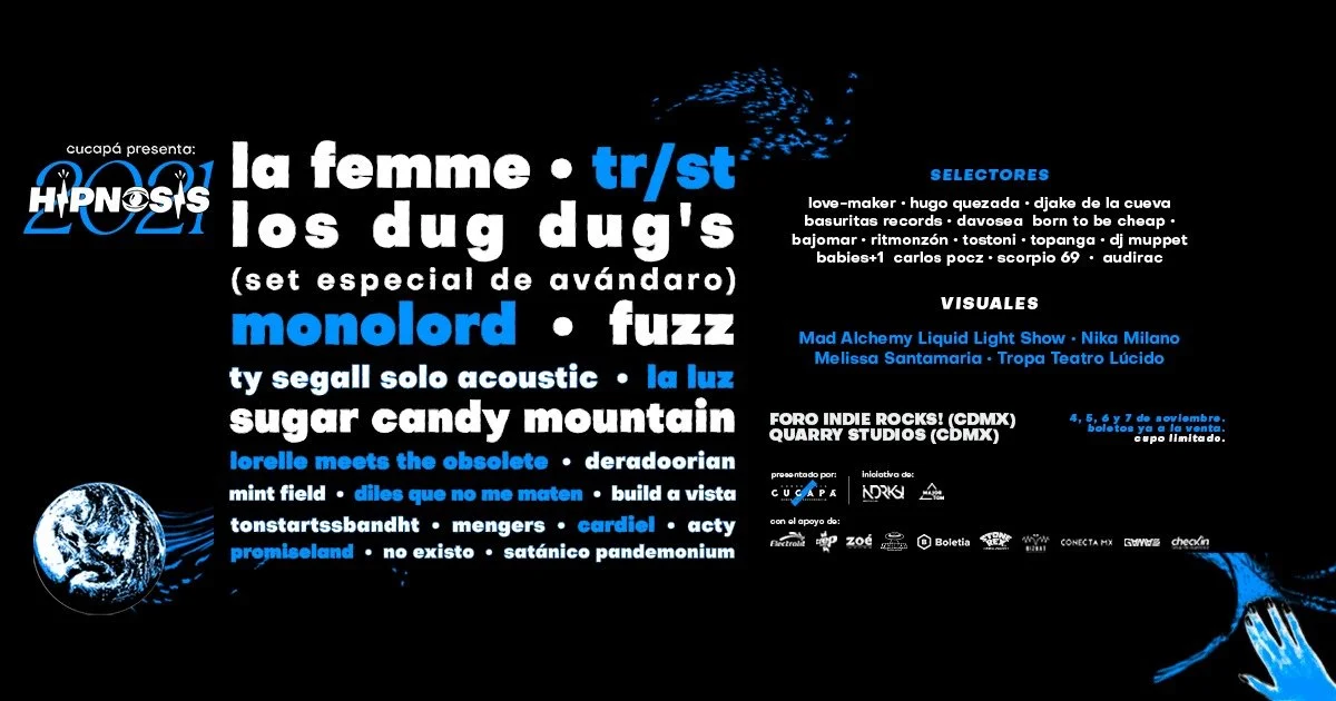 ¡Por fin salió el cartel completo de la edición 2021 del Hipnosis! La Femme, FUZZ, Mengers, TR/ST, La Luz, Sugar Candy Mountain, Lorelle Meets the Obsolete, Cardiel, Satánico Pandemonium y más bandas estarán presentes en el Foro Indie Rocks, ubicado en la Ciudad de México del 4 al 7 de noviembre.