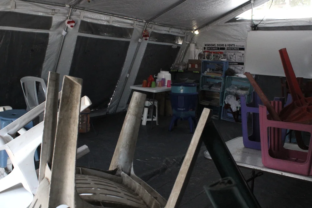 Otras organizaciones como Fundación Cántaro Azul apoyaron con recursos para el campamento donde ahora está la escuela. “Hay pizarrones, banquitos, y sillas dentro de la carpa; hasta hace poco trajeron garrafones para que los niños puedan tomar agua durante la clase”, añade Pilar Valle, otra de las madres de familia.