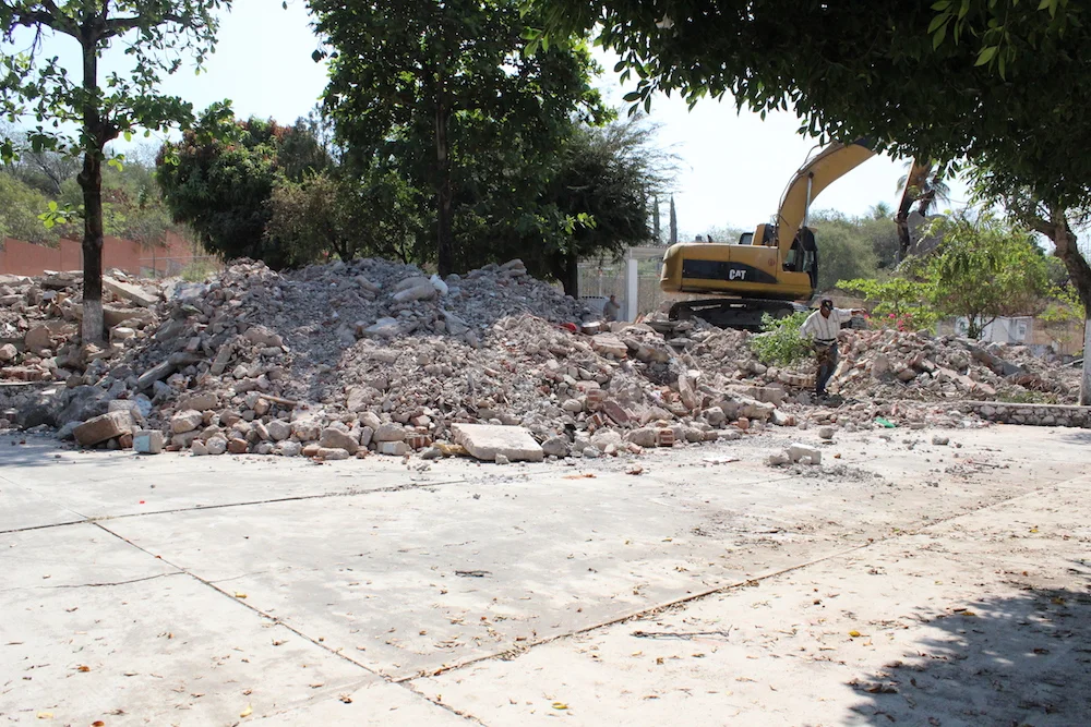 El calor aumenta con los minutos. Al lugar van llegando los trabajadores que operan la maquinaria para demoler las instalaciones dañadas. Son 3 secciones en la escuela, cada una consta de 2 salones con baños. Además de 3 salas multiusos.