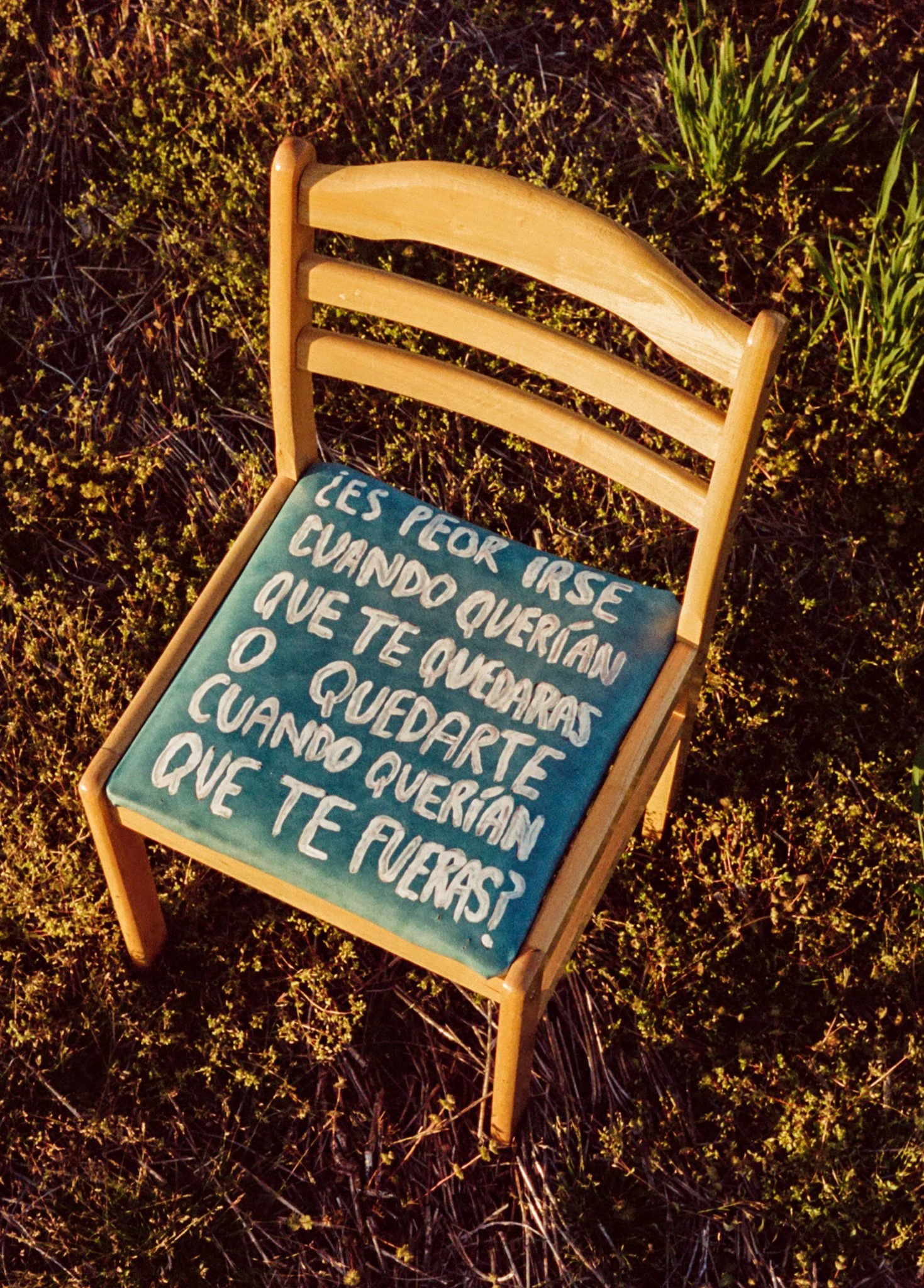 Las sillas también me llaman mucho la atención, desde que leí un ensayo de Jimmie Durham –en el que hablaba sobre que las sillas son objetos de control social– me metí mucho en todo lo que rodeaba una silla. Sin embargo, yo las vi desde la perspectiva de la ausencia: cuando vemos una mesa o un archivero vacío, pensamos que no hay nada; pero cuando cambiamos ese mueble por una silla, el ‘nada’ cambia por ‘nadie’. Y al final la ausencia también es un tema recurrente en mis proyectos.