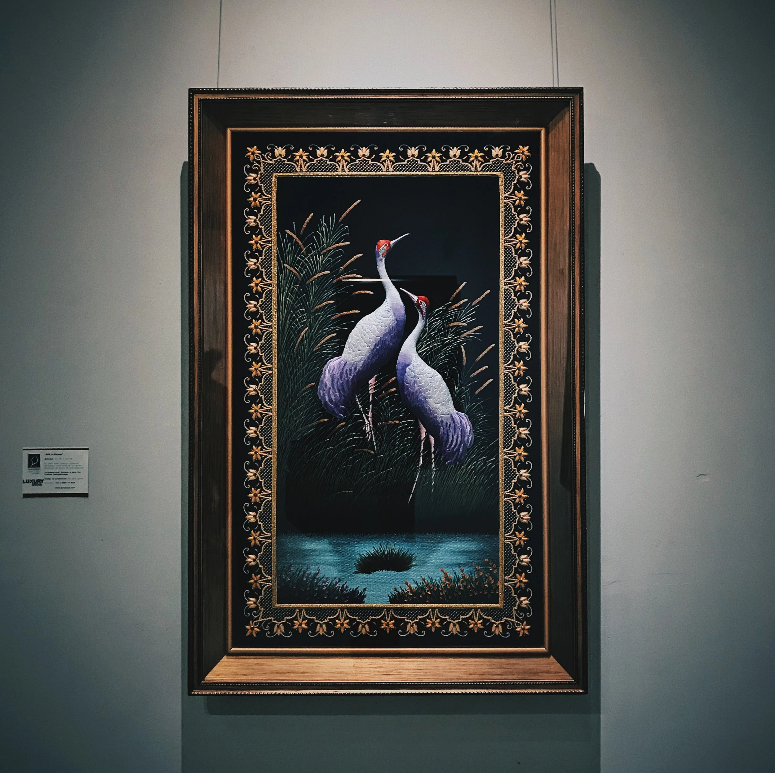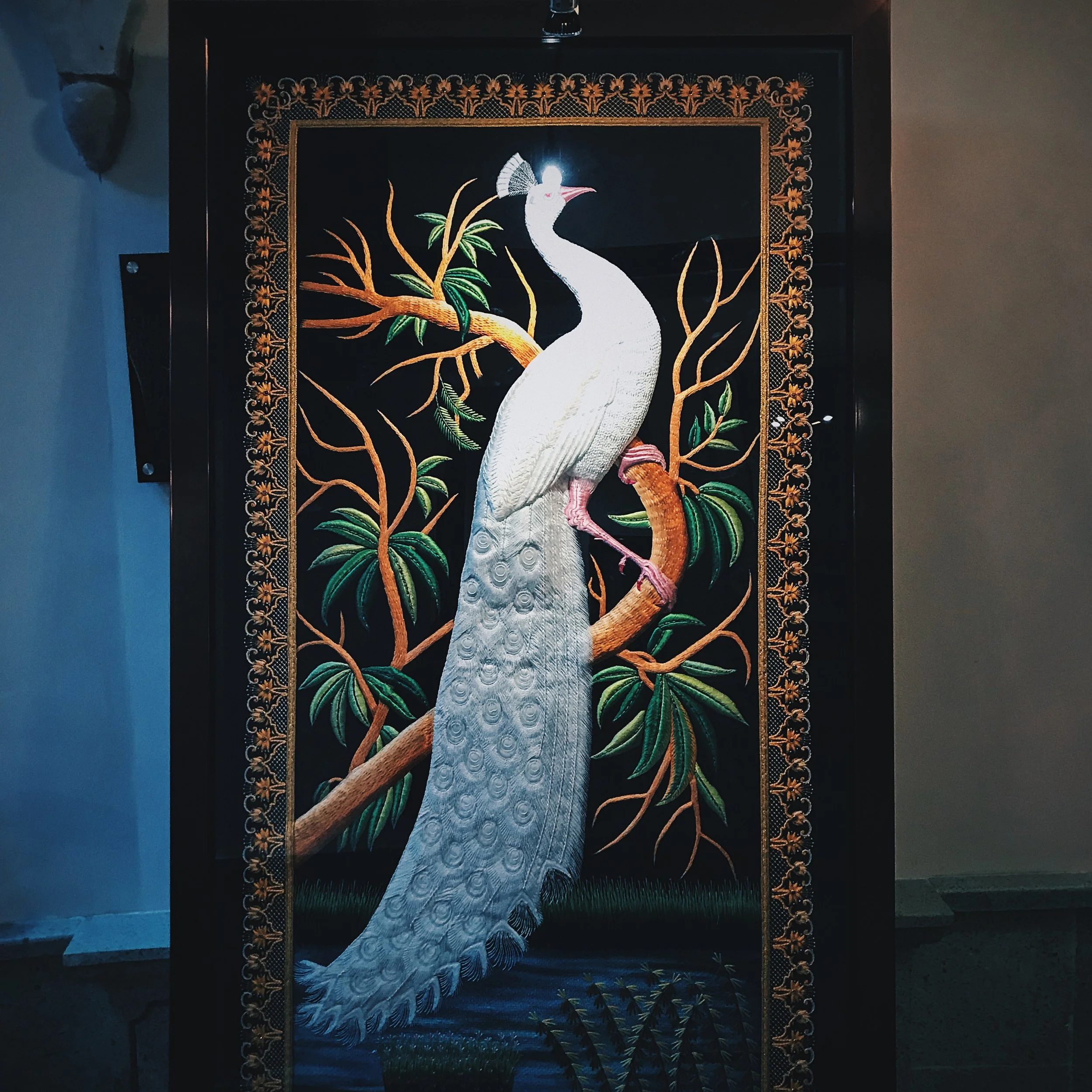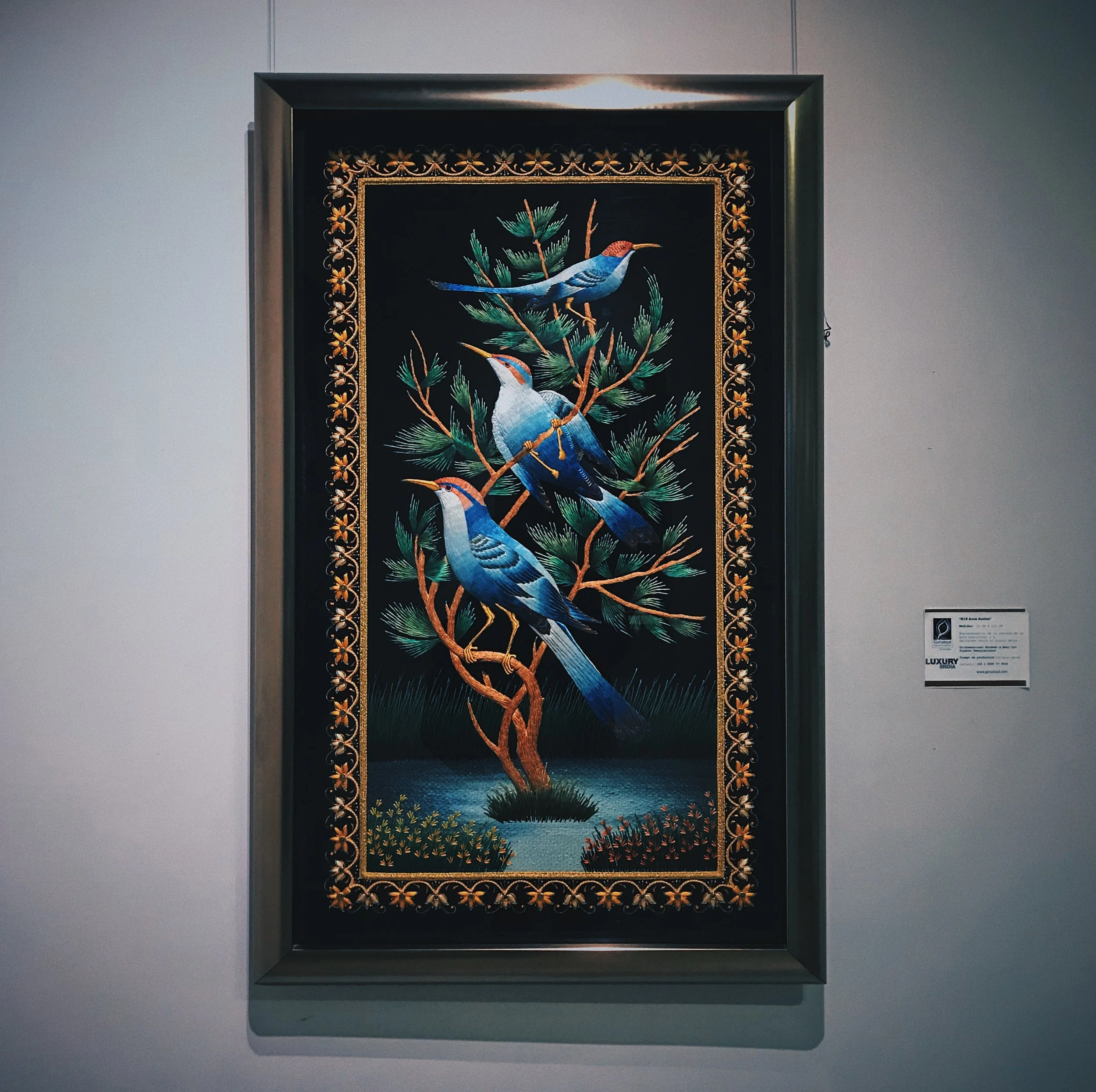 La confección de estos lienzos hilados es resultado de una producción que a veces supera los cuatro años, dependiendo del tamaño y complejidad de sus imágenes. La potentísima iconografía que enclaustra, desde los imprescindibles Pavo Reales, hasta caballos, elefantes, garzas, tigres e incluso, gallos de pelea, se enriquece con los materiales que los conciben. Filamentos metálicos y piedras semipreciosas (que también incluyen turquesas y ónix), otorgan a las piezas un acabado tornasolado que a la luz se revela como un baño de divinidad y polvo de ensueño.