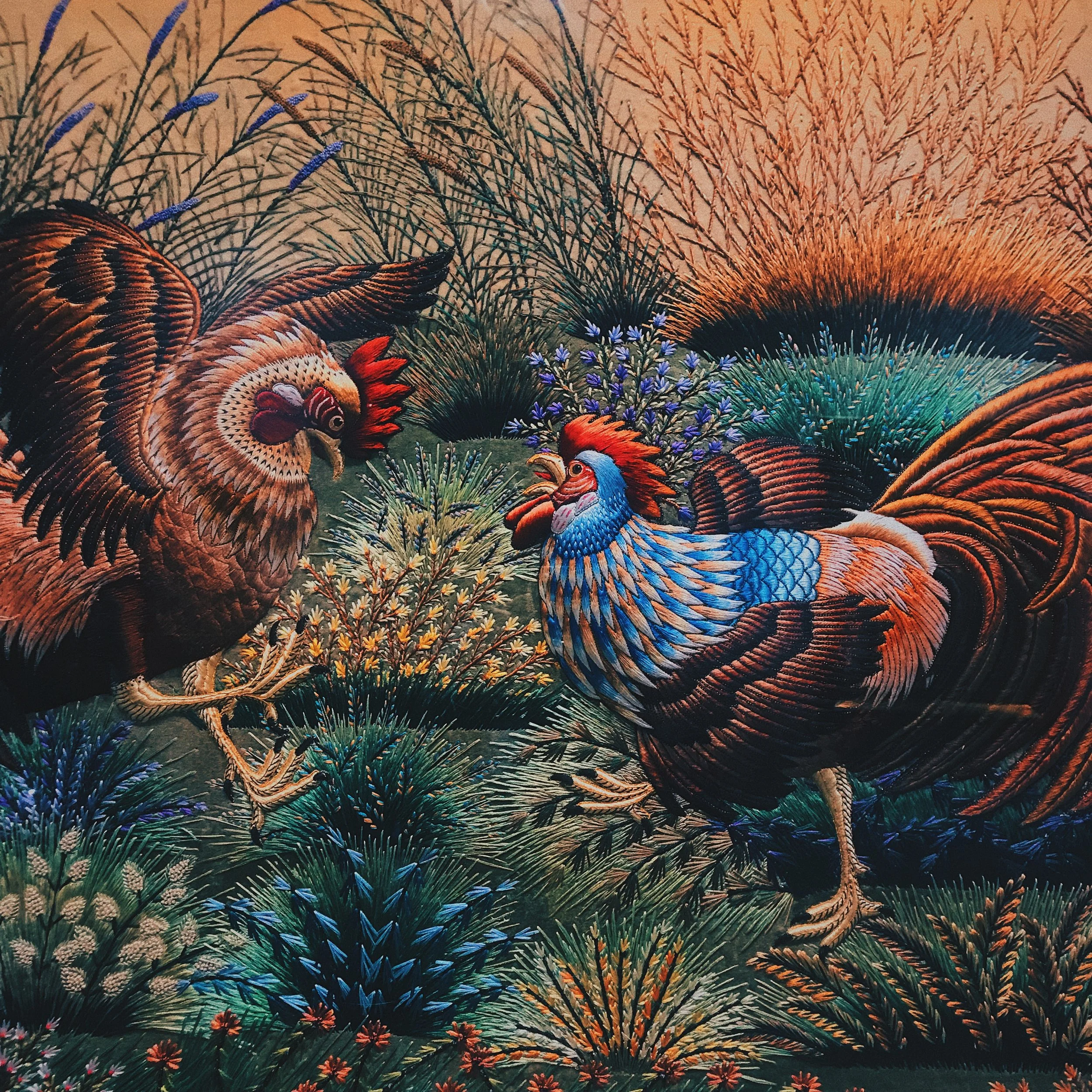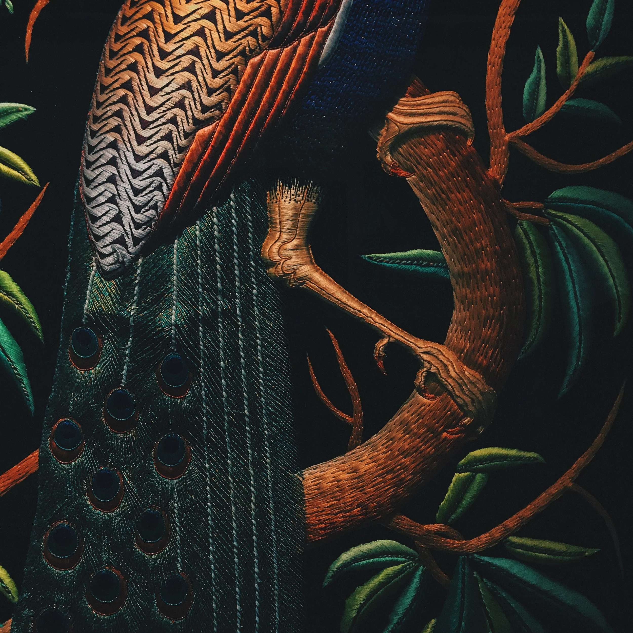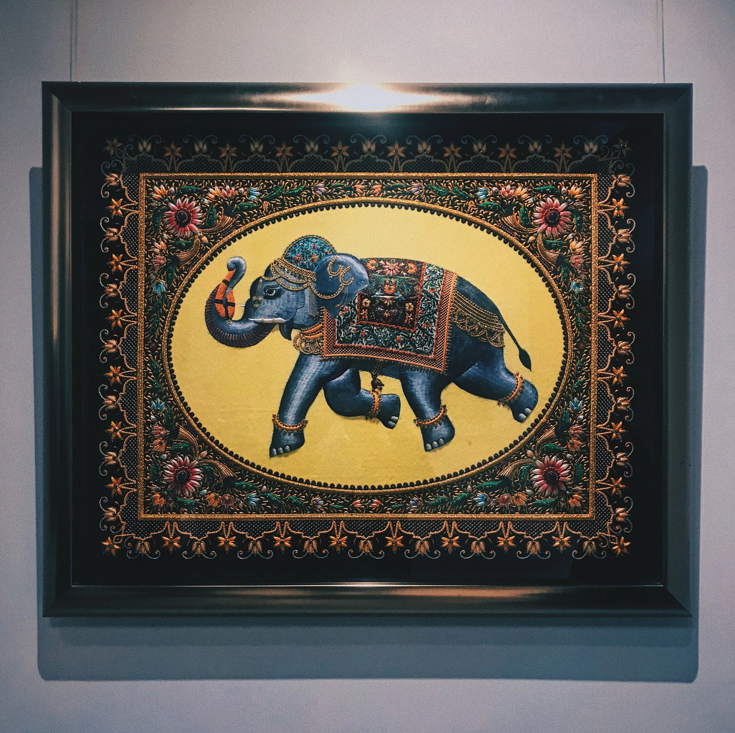 La confección de estos lienzos hilados es resultado de una producción que a veces supera los cuatro años, dependiendo del tamaño y complejidad de sus imágenes. La potentísima iconografía que enclaustra, desde los imprescindibles Pavo Reales, hasta caballos, elefantes, garzas, tigres e incluso, gallos de pelea, se enriquece con los materiales que los conciben. Filamentos metálicos y piedras semipreciosas (que también incluyen turquesas y ónix), otorgan a las piezas un acabado tornasolado que a la luz se revela como un baño de divinidad y polvo de ensueño.