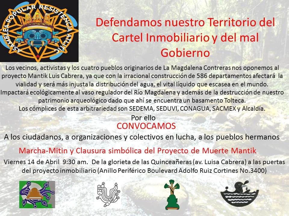 El pasado 14 de abril se llevó a cabo una marcha en contra del proyecto Mantik Luis Cabrera en la Ciudad de México, en la cual participaron vecinos, activistas y pobladores de San Nicolás Totolpan, San Bernabé Ocotepec, la Magdalena Atlitic y San Jerónimo Lídice Aculco llevaron a cabo una clausura simbólica del proyecto inmobiliario.