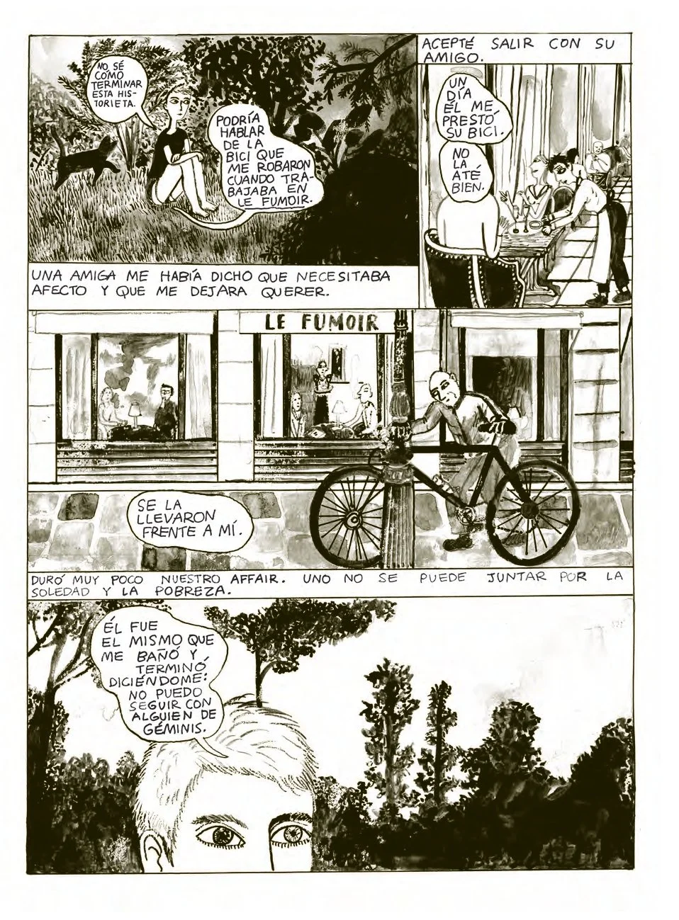 Los negros y grises abundan los dibujos en este libro, así como la presencia de agujeros negros y una criatura salvaje. Sin embargo, entre tanto claroscuro, la bicicleta siempre vuelve como un elemento que tras una pérdida o un rato de oscuridad, permite explorar nuevas posibilidades, ya sea en forma de calles, rostros cotidianos o experiencias para contar.