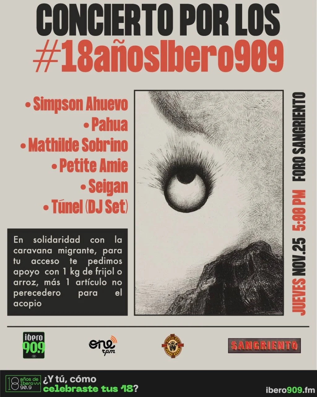 Este jueves 25 de noviembre continuamos celebrando los 18 años de Ibero 90.9 al aire y por ello, hemos reunido seis talentos mexicanos que prometen un día de festejo inolvidable, el cual no te puedes perder. El concierto será al aire libre en el foro Sangriento, dentro de la Ex-Fábrica de Harina. Y a la espera de la gran noche te compartimos un adelanto del talento invitado: