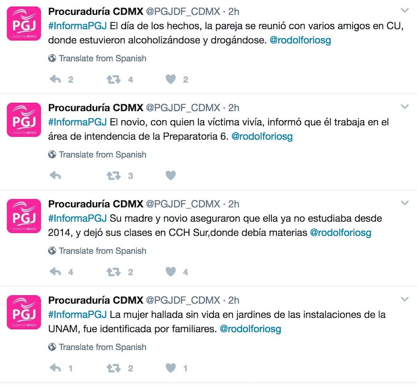 La Procuraduría General de Justicia de la Ciudad de México (PGJCDMX) también escribió tweets acerca de lo acontecido, comenzando el relato describiendo cómo se había encontrado la víctima y publicando más mensajes donde se minimizaba a la joven. "Ya no estudiaba desde 2014, y dejó sus clases en CCH Sur, donde debía materias", se escribió en un tweet.