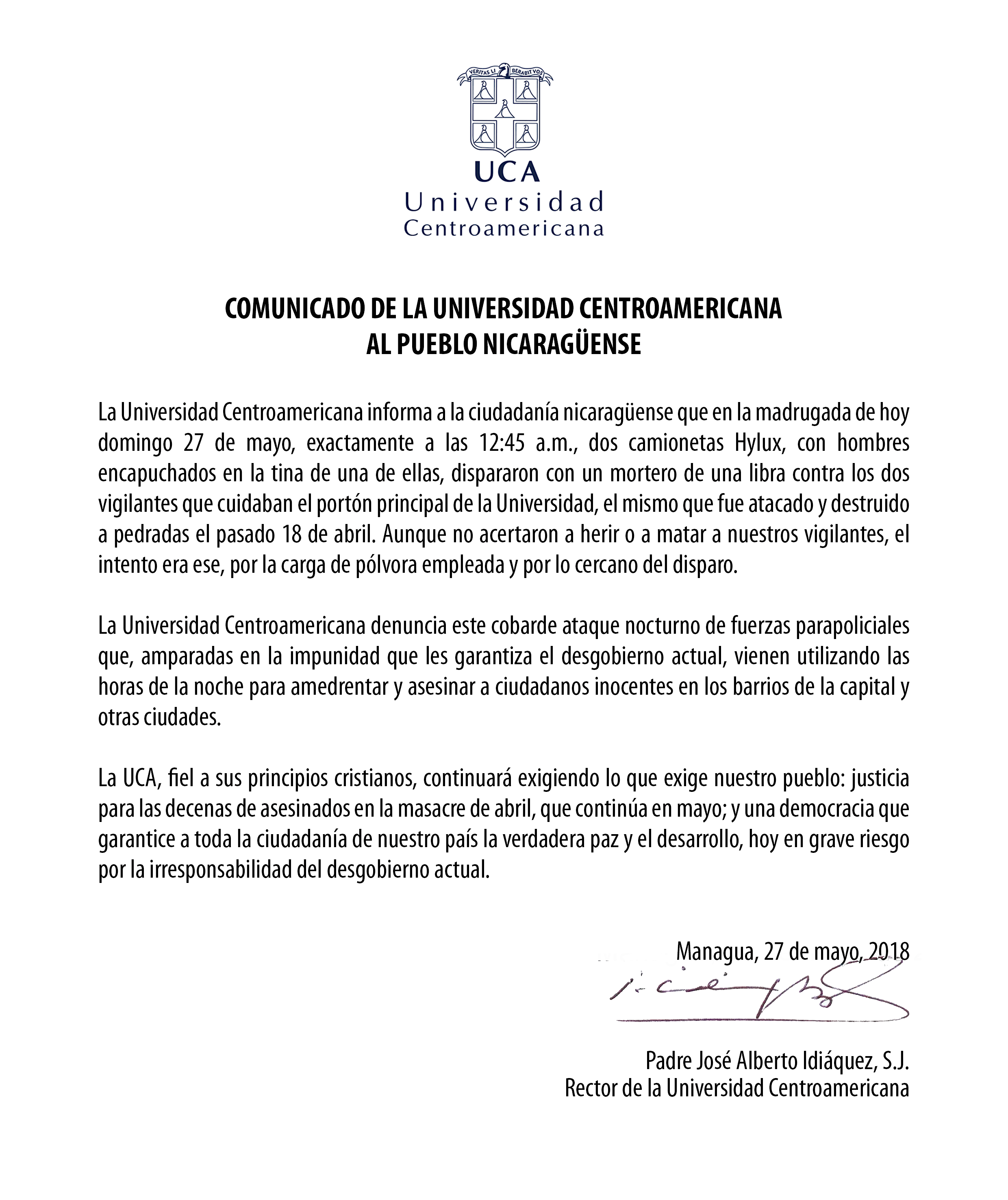 La Universidad Centroamericana (UCA), miembro del Sistema Universitario Jesuita (SUJ), sufrió un ataque en la madrugada del pasado domingo 27 de mayo, dirigido hacia los vigilantes de las instalaciones. El atentado fue realizado por cuerpos paramilitares.