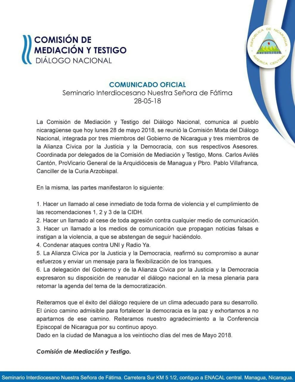 El 28 de mayo, la Comisión Mixta del Diálogo Nacional, integrada por tres miembros del Gobierno de Nicaragua y tres miembros de la Alianza Cívica por la Justicia y la Democracia, hizo un comunicado con la esperanza de recuperar la disposición y apertura en la mesa.