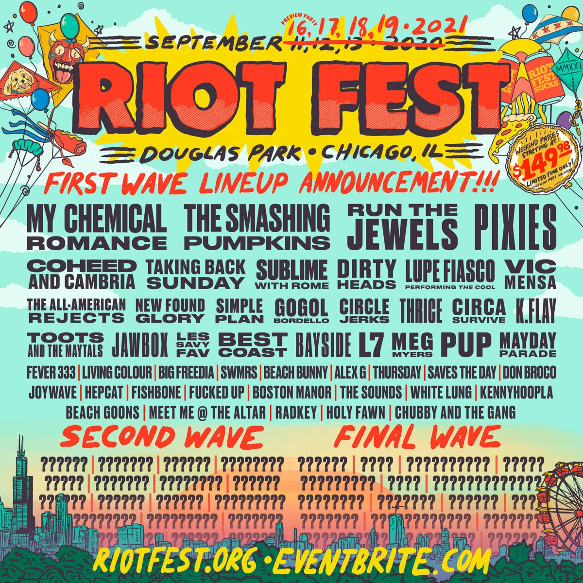 Este festival de Chicago anunció que se llevaría a cabo, como medida de seguridad y precaución, el 16 y 17 de septiembre del 2021, y para la buena suerte de los amantes de estos eventos musicales, ya se dio a conocer la primer ola de artistas que formarán parte del lineup. Run The Jewels, My Chemical Romance, Pixies y Taking Back Sunday, son algunos de los proyectos que se presentarán en esta edición del Riot Fest. Sin embargo, el festival anunciará nuevos talentos que tocarán en el evento. Para más información puedes visitar su página web.