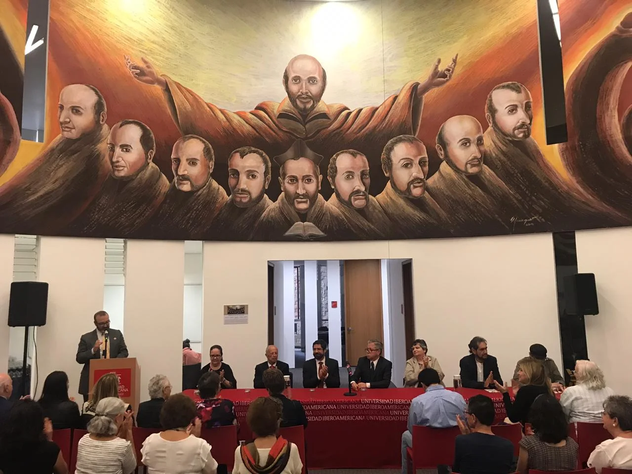 La obra estuvo a cargo del profesor Francisco Meseguer, docente del departamento de diseño de la Ibero. Al encuentro también asistieron la Mtra. Madelaine Izquierdo, el Mtro. Emilio Quesada, asesor histórico sobre la orden jesuita, el Dr. Alejandro Guevara, vicerrector; el Mtro. David Fernández, rector; la Mtra Teresa Matabuena, directora de la Biblioteca; y el Mtro. Carlos Mario Castro.