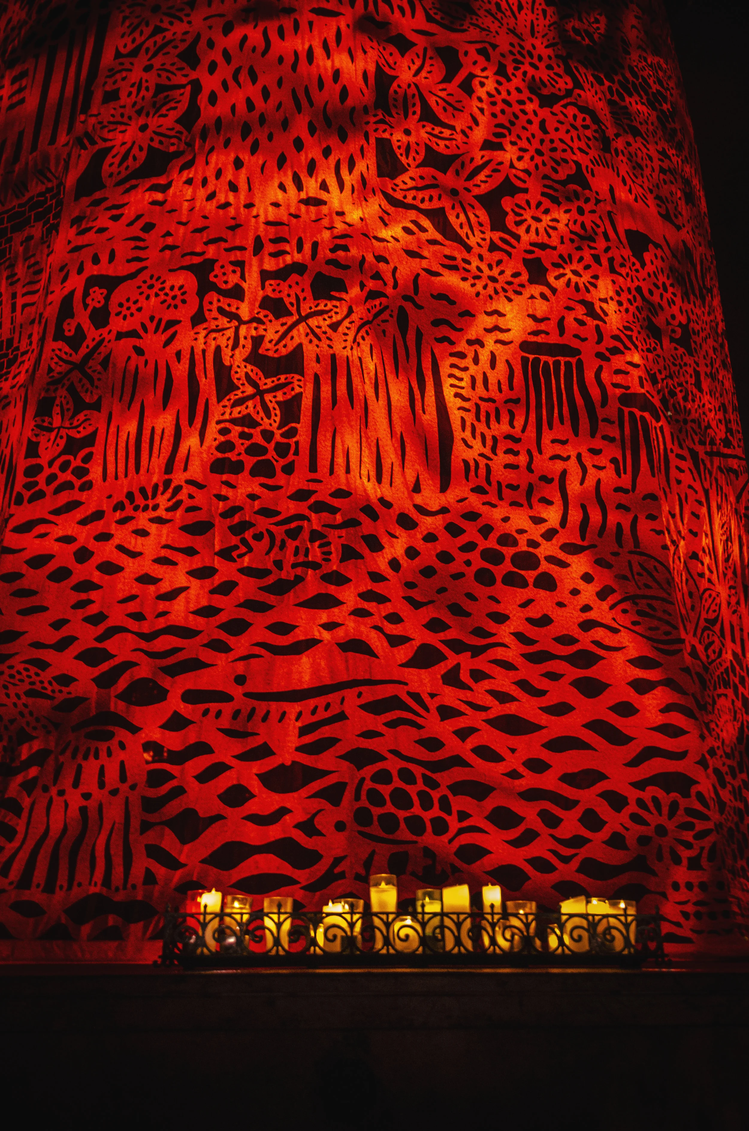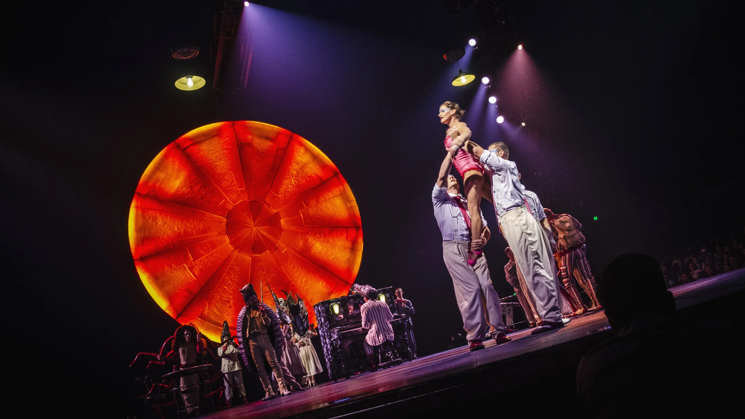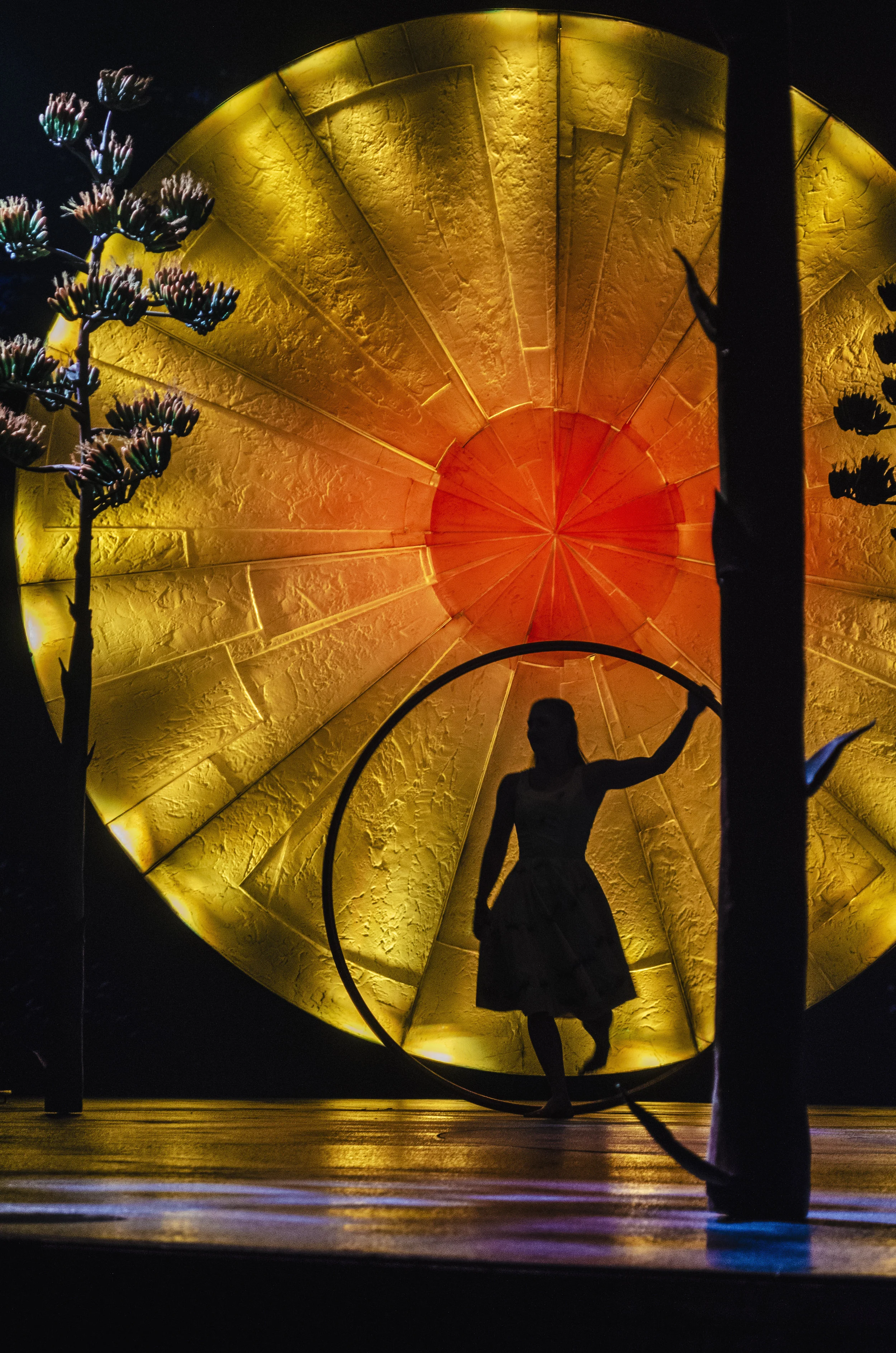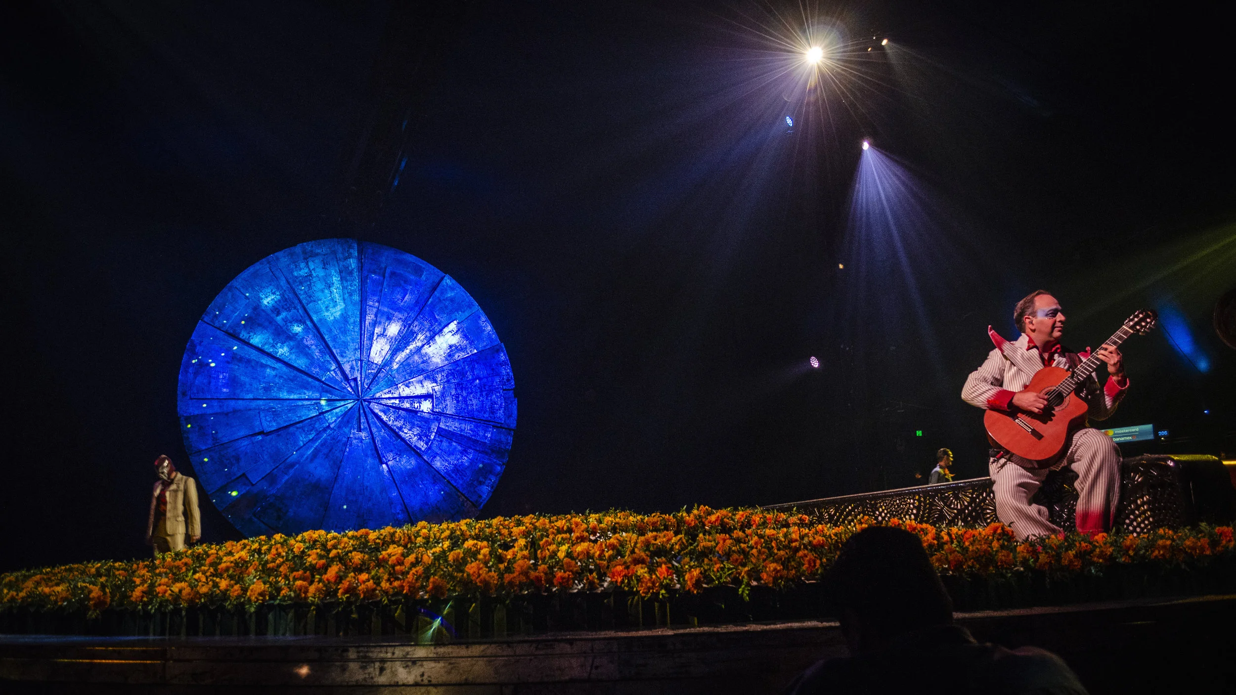 Un escenario tapizado de flores de cempasúchil recibe a los espectadores al entrar a la gran carpa Soleil. Al fondo hay un disco metálico con luz tenue. Se escuchan cigarras y se perciben olores dulces: el lugar está en calma.