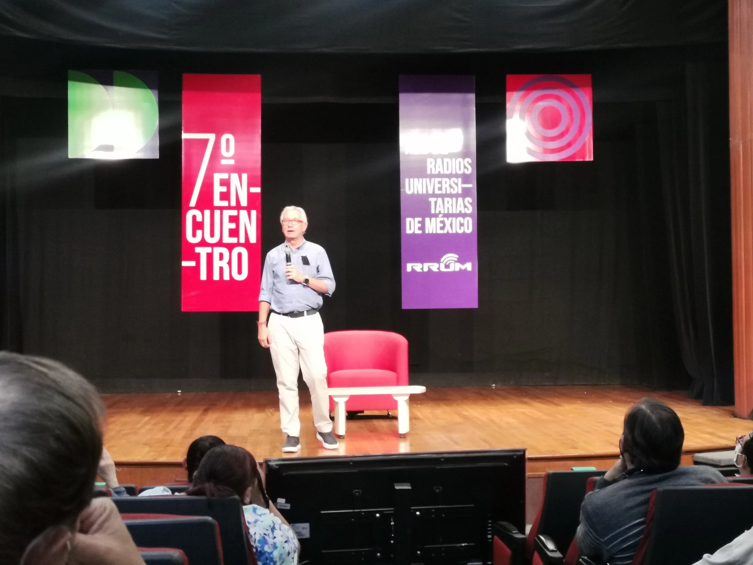 El periodista Javier Solórzano ofreció una conferencia magistral en el cierre del 7o Encuentro de la Red de Radios Universitarias Red de Radios Universitarias de México en San Luis Potosí, donde repasó la historia de los medios de comunicación y su poder, desde los privados hasta la necesidad de los públicos y cómo es que han cogobernado al país. También habló de las audiencias y defensoría de las mismas.
