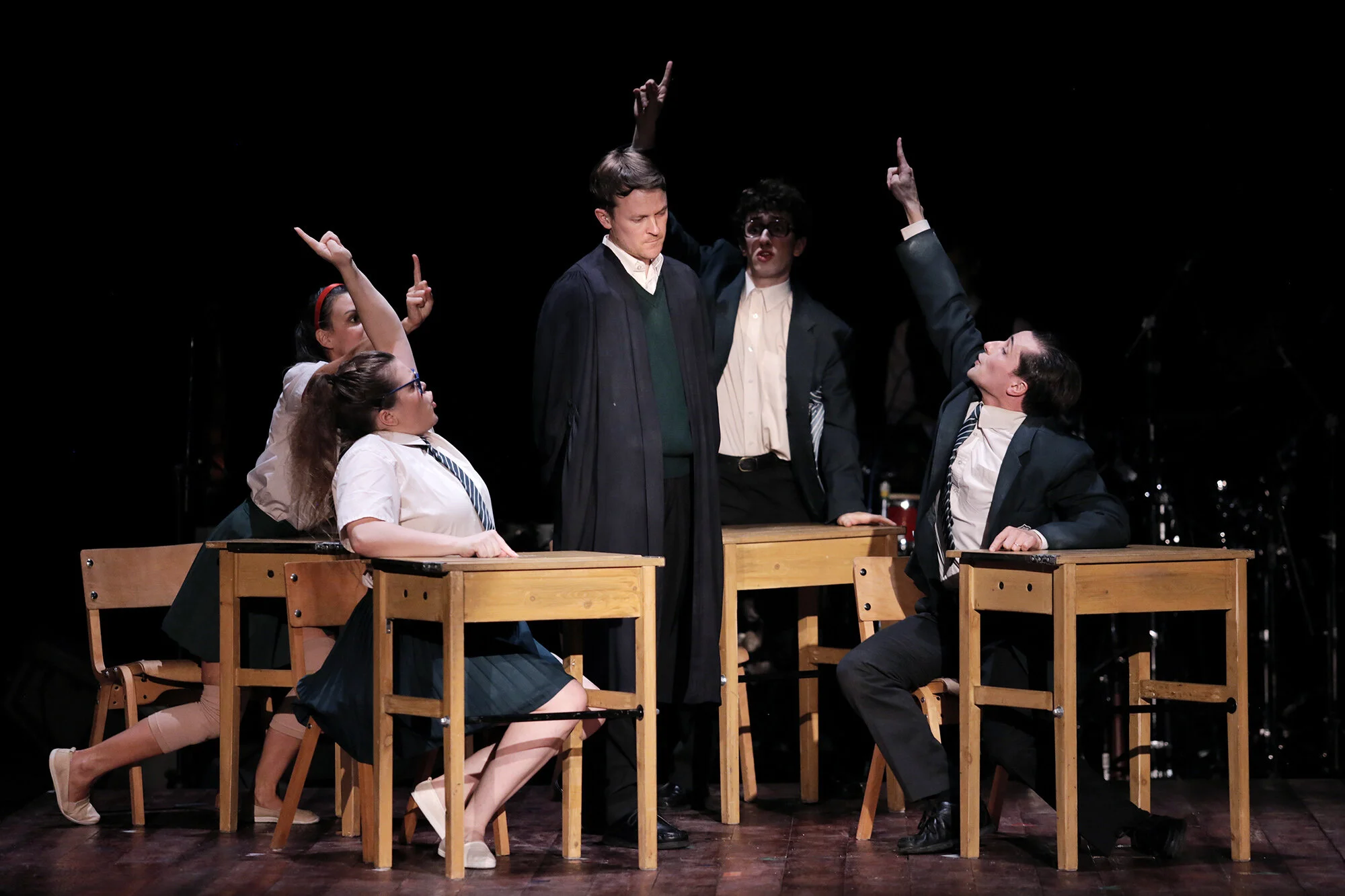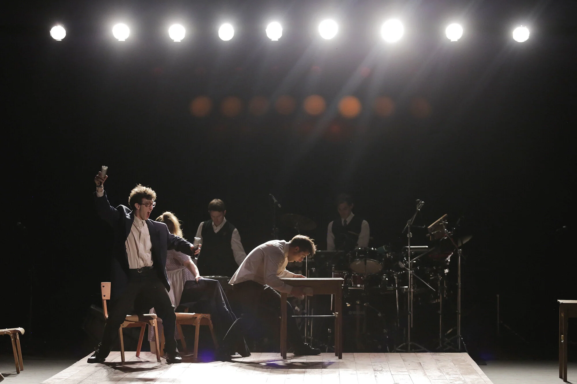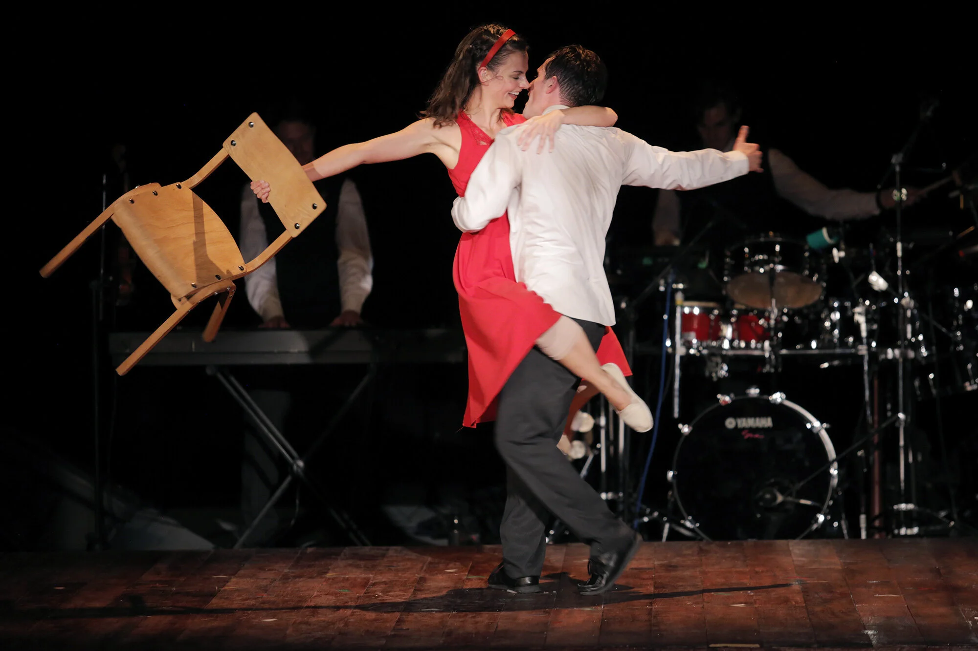 La puesta en escena es divinamente reforzada por la música —creada específicamente para la obra— y acentúa movimientos específicos de los actores, logrando una sincronía perfecta gracias a un multi-instrumentista y un percusionista al fondo del escenario. Como resultado se logra un espectáculo audiovisual que pocas veces se ve.