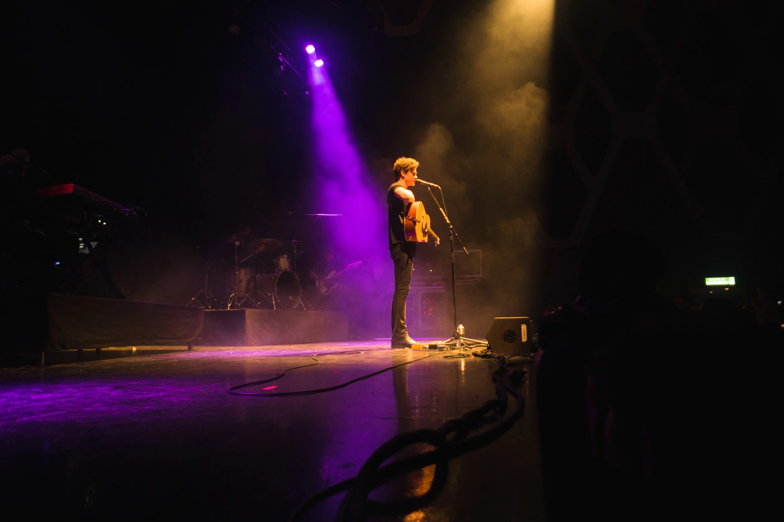 Desde la zanja que separa el público del escenario, se observa una línea de luz vertical. Como el vidrio de un aparador, separa el objeto de deseo de todos aquellos que están frente a él. Vance Joy no interactúa con el público, se dirige a éste para explicar sus canciones, los saluda y cuando llega el momento se despide, pero hace caso omiso de las respuestas. Lo mismo sucede con los músicos que le acompañan: están en un segundo plano e inmersos en oscuridad y, como si no fuesen esenciales para lograr sus crescendos con ritmos optimistas o el contraste en su pausas melancólicas, no los mira en ningún momento más que para la habitual presentación: Chris Mulhall en el teclado y las segundas voces, el más destacable del grupo.