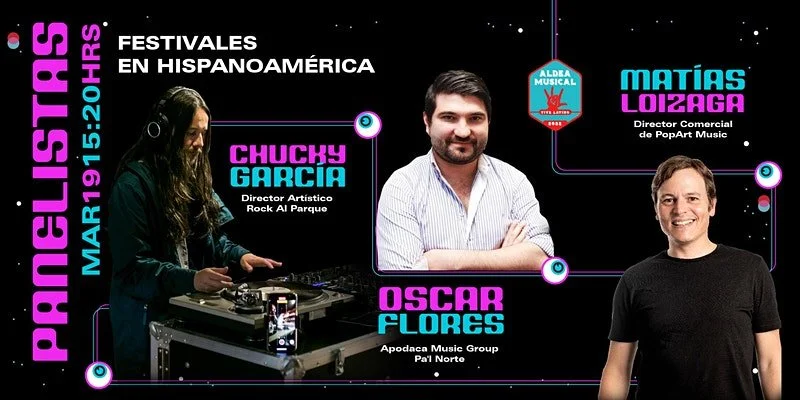 Gustavo Chucky García (comunicador social y periodista musical), Matías Loizaga (Director Comercial y de Entretenimiento de Pop Art Music) y Oscar Flores (fundador de Apodaca Music Group) desvelarán todo lo que hay detrás de la organización y cultura de los festivales en Hispanoamérica.
