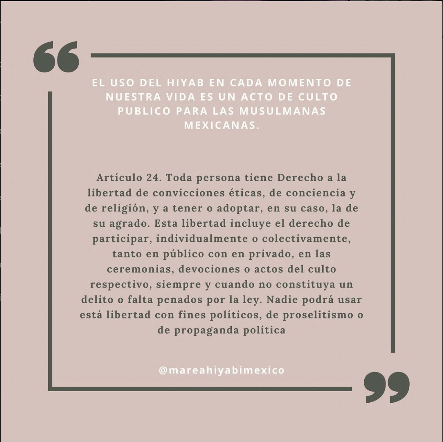 Marian Viviana Cruz, miembro del movimiento La Marea Hijabi de México, compartió su experiencia al intentar obtener su pasaporte mexicano usando el hiyab. En 2014, se le negó este derecho bajo el pretexto de "seguridad nacional", aunque las regulaciones internacionales permiten el uso del hiyab en documentos oficiales.