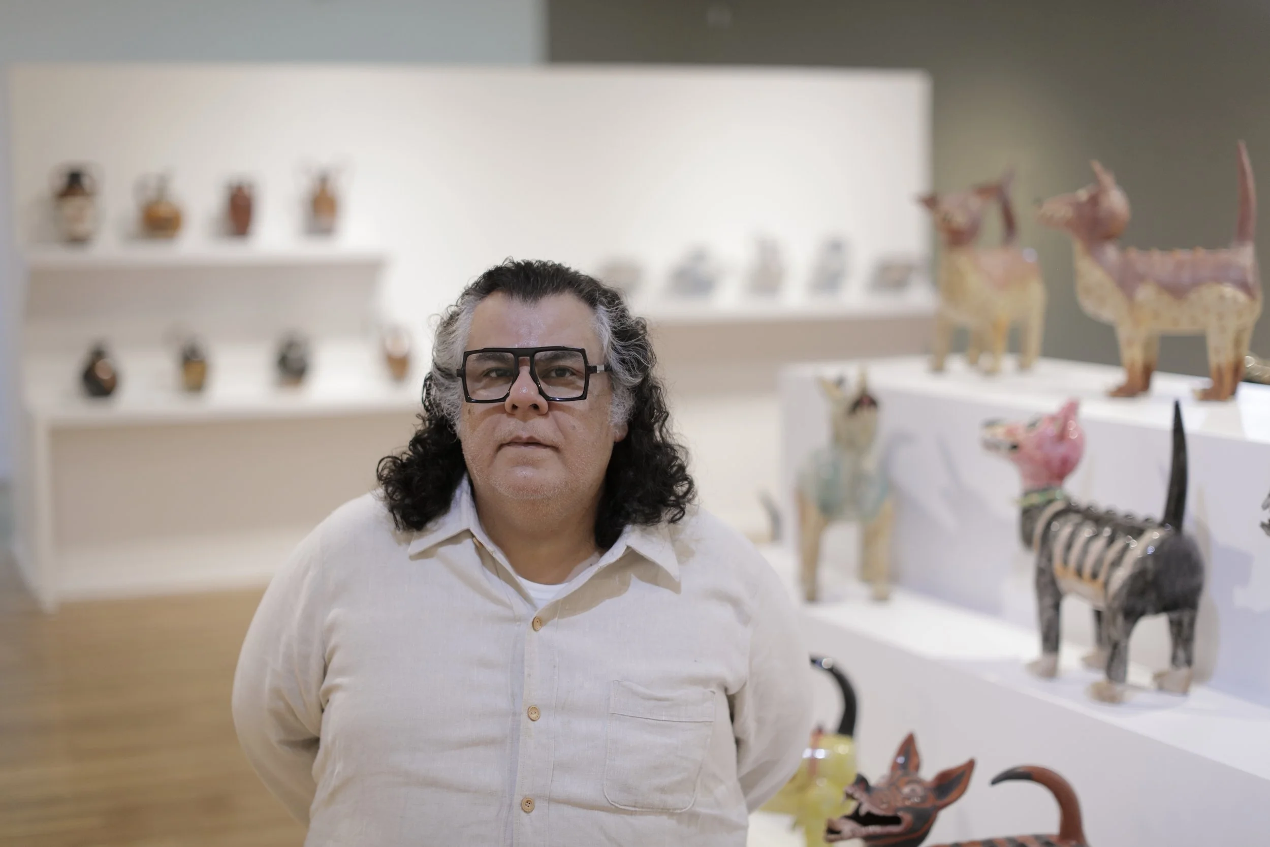 “Tengo un perro escondido, encerrado y amarrado, lo alimento de resentimiento, el desprecio que recibo lo guardo para su cena durante el día”Mi perro bravo, Víctor Hugo Pérez.En Proyectos Monclova encontré lienzos enormes de mujeres jugando gatos, pájaros voladores, ollas, platos y perros de barro con caras monstruosas, ojos de serpiente y piel de leopardo hechos con la técnica original de los artesanos de Tonalá. Estos artilugios son parte de la obra de Víctor Hugo Pérez, quien me compartió sobre su arte y el enorme universo simbólico que ha construido a lo largo de 30 años de trayectoria.