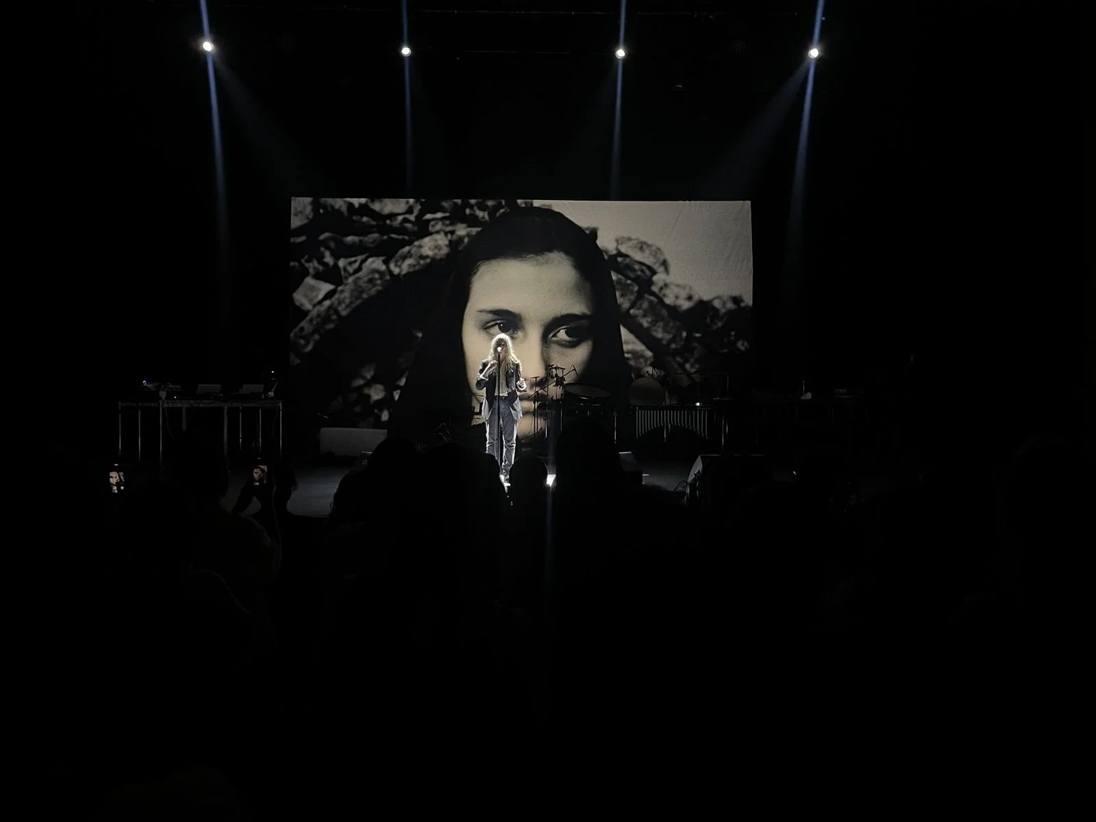 El teatro se transformó en un viaje audiovisual, con el despliegue de una gama de emociones a través de paisajes sonoros y visuales. Se proyectaron fotografías y videos de archivo tanto de Patti como de Stephan. La estructura del performance estaba anclada a cinco o seis poemas largos de la autoría de Patti, que ella misma recitó al frente del escenario, como si dirigiera una orquesta. Los músicos iban construyendo las atmósferas que te sumergían en la poética de Smith, que entre piezas tomaba un poco de agua de una botella para remojarse la cara, o dejar caer un escupitajo chorreado para combatir la resequedad de su boca. El colectivo imitaba sonidos de la naturaleza, de manera tan detallada, que cuando uno de los poemas habló sobre hielo, Crasneanscki descubrió un bloque de hielo gigantesco que golpeaba y raspaba rítmicamente mientras Patti recitaba un poema que nos hacía reflexionar sobre el calentamiento global. Lágrimas salían de mis ojos y a mi alrededor escuchaba a personas expresar emociones, ya sea felicidad, tristeza o una combinación de ambas. Patti dejaba caer las páginas que terminaba de leer con la presencia de una figura mítica del punk que es, las hojas caían al suelo y los sonidos iban en aumento.